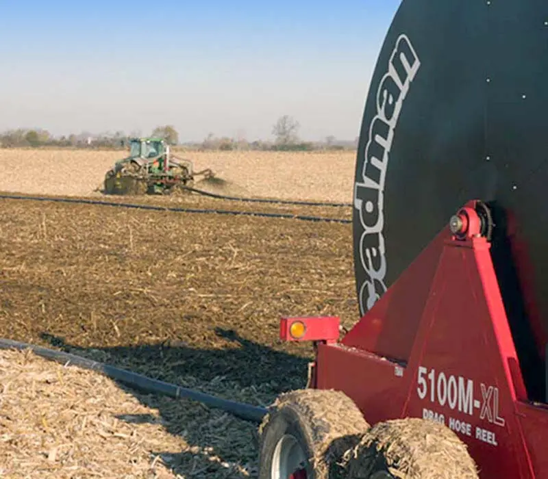 Cadman M-Series drag reels support large-diameter hoses and high flow rates, enabling efficient manure transfer across large fields.